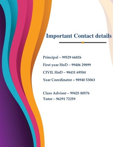 Important Contact details Principal – 99529 66826 First year HoD – 99406 29899 CIVIL HoD – 98431 69584 Year Coordinator – 98940 53063 Class Advisor – 99425 80576 Tutor – 96291 72259
