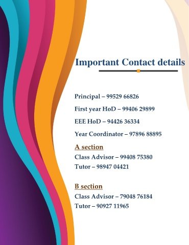 Important Contact details Principal – 99529 66826 First year HoD – 99406 29899 EEE HoD – 94426 36334 r Coordinator – 97896 88895 Yea A section Class Advisor – 99408 75380 Tutor – 98947 04421 B section Class Advisor – 79048 76184 Tutor – 90927 11965